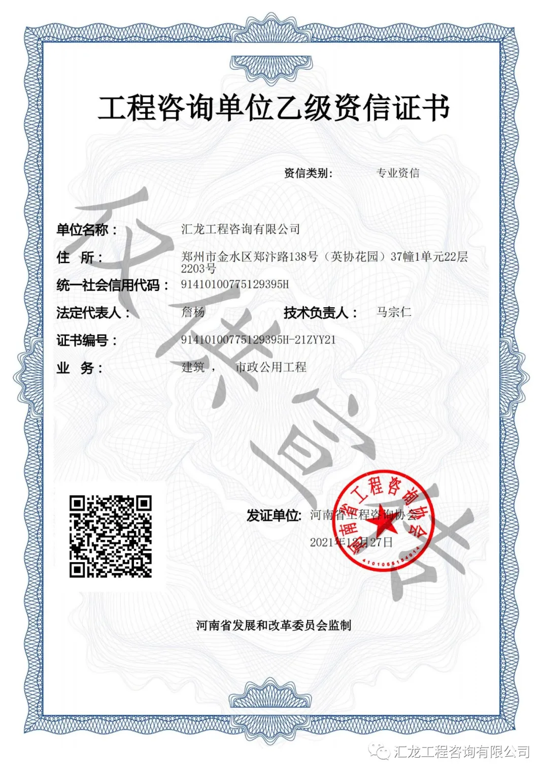 日前,河南省工程咨詢協(xié)會公布了《關于2021年乙級資信評價結果的公告》,匯龍工程咨詢有限公司順利通過了省咨詢協(xié)會組織的工程咨詢單位乙級資信評價,取得了建筑、市政公用工程兩個專業(yè)的乙級資信。