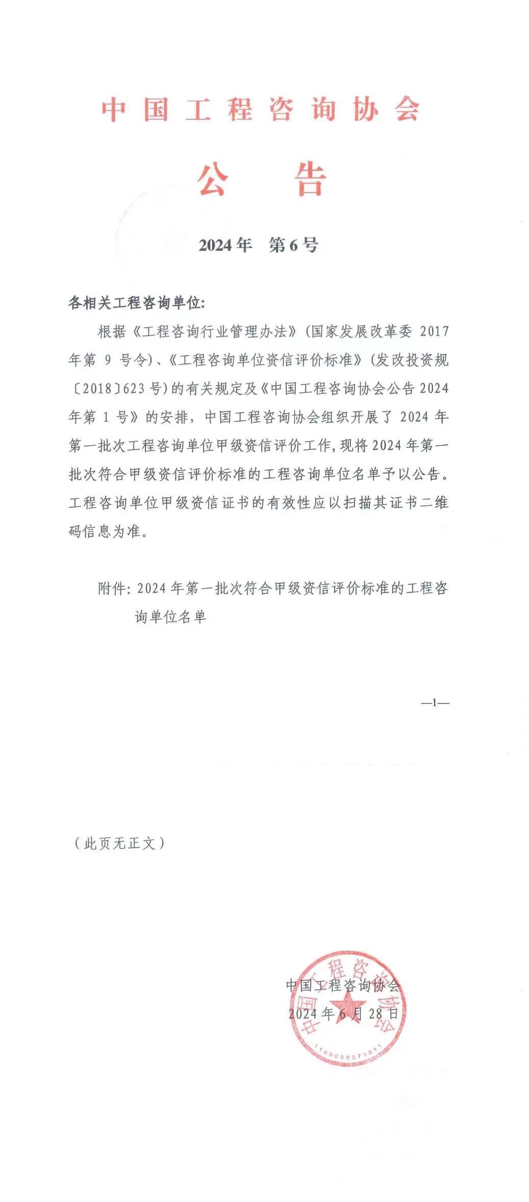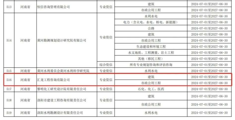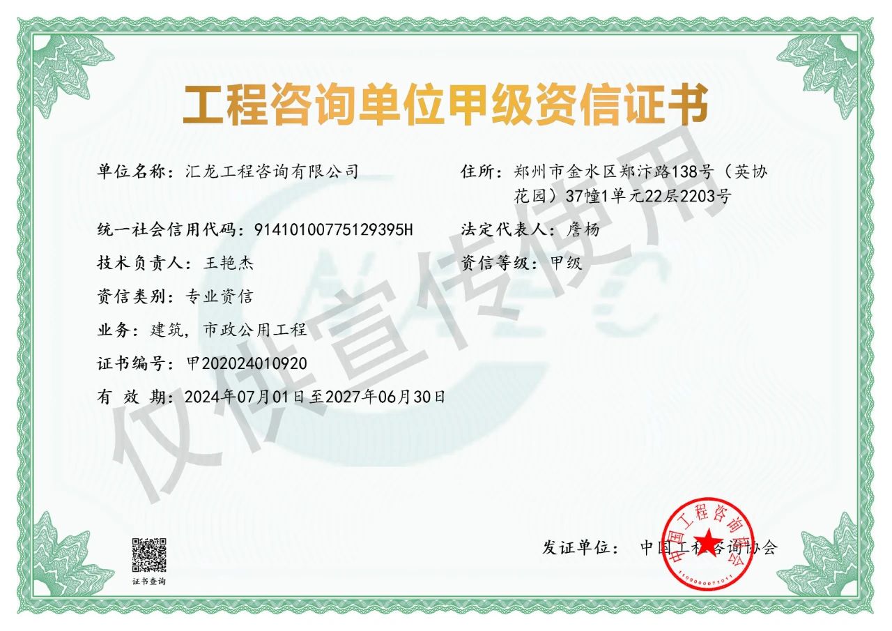 2024年6月28日,中國工程咨詢協(xié)會(huì)發(fā)布了2024年第6號(hào)公告,匯龍工程咨詢有限公司順利通過2024年第一批工程咨詢單位甲級(jí)資信評(píng)價(jià)工作,獲得工程咨詢單位資信甲級(jí)證書,可承接的業(yè)務(wù)范圍進(jìn)一步拓寬,企業(yè)綜合實(shí)力邁上新的臺(tái)階。